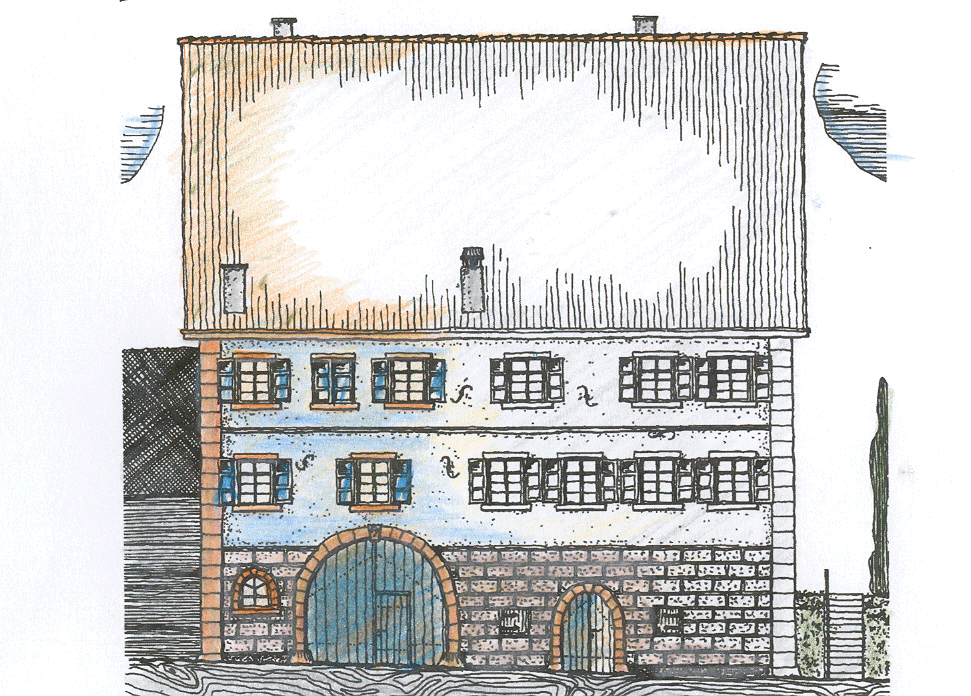 Rekonstruktion der Schaufassade. Colorierte Tuschezeichnung.